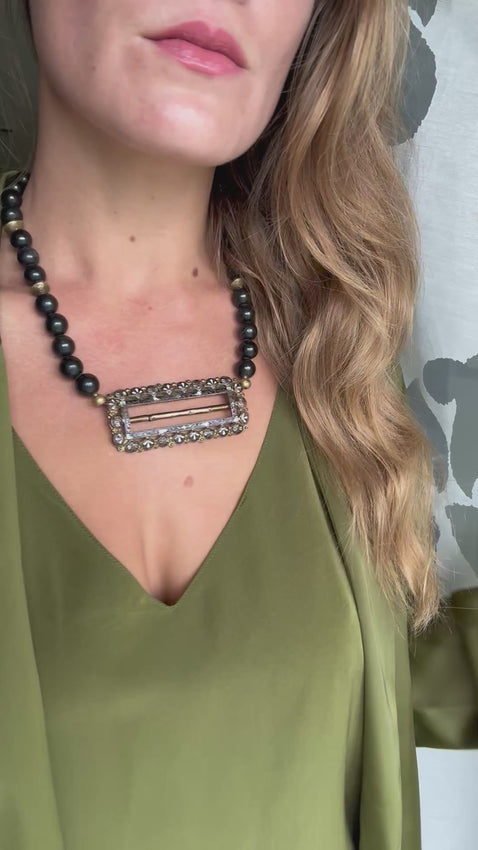 A special statement piece, this Victorian era re-claimed enamel sash buckle hangs from black and brass beads. An embellished extension chain makes the necklace length adjustable.